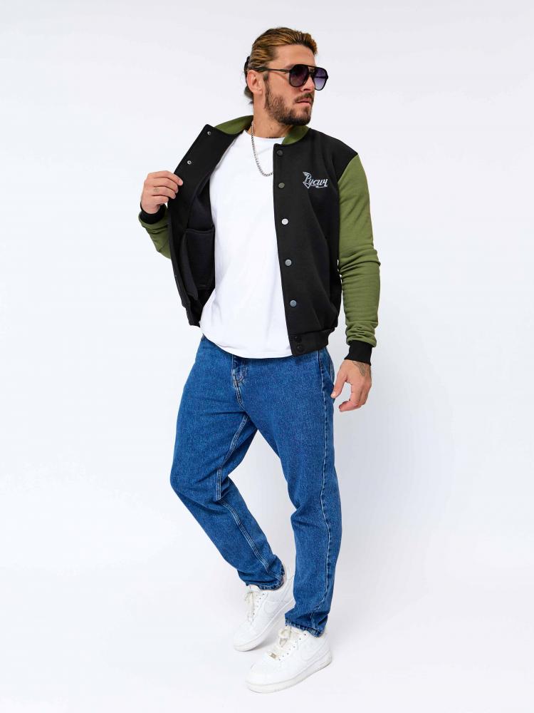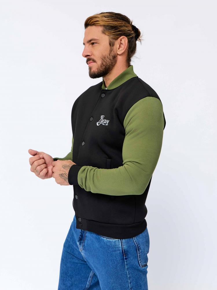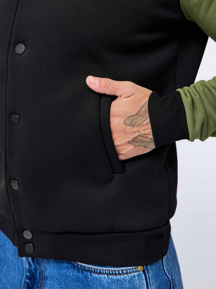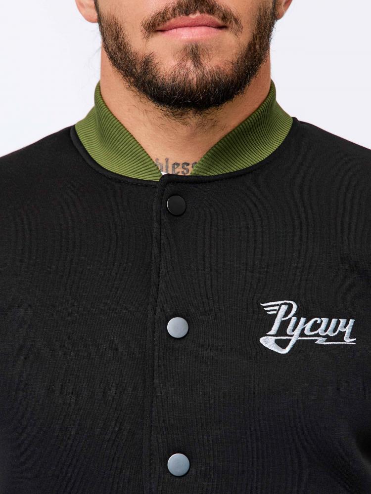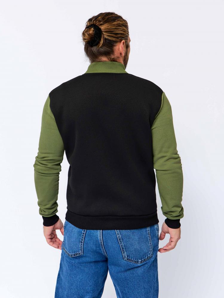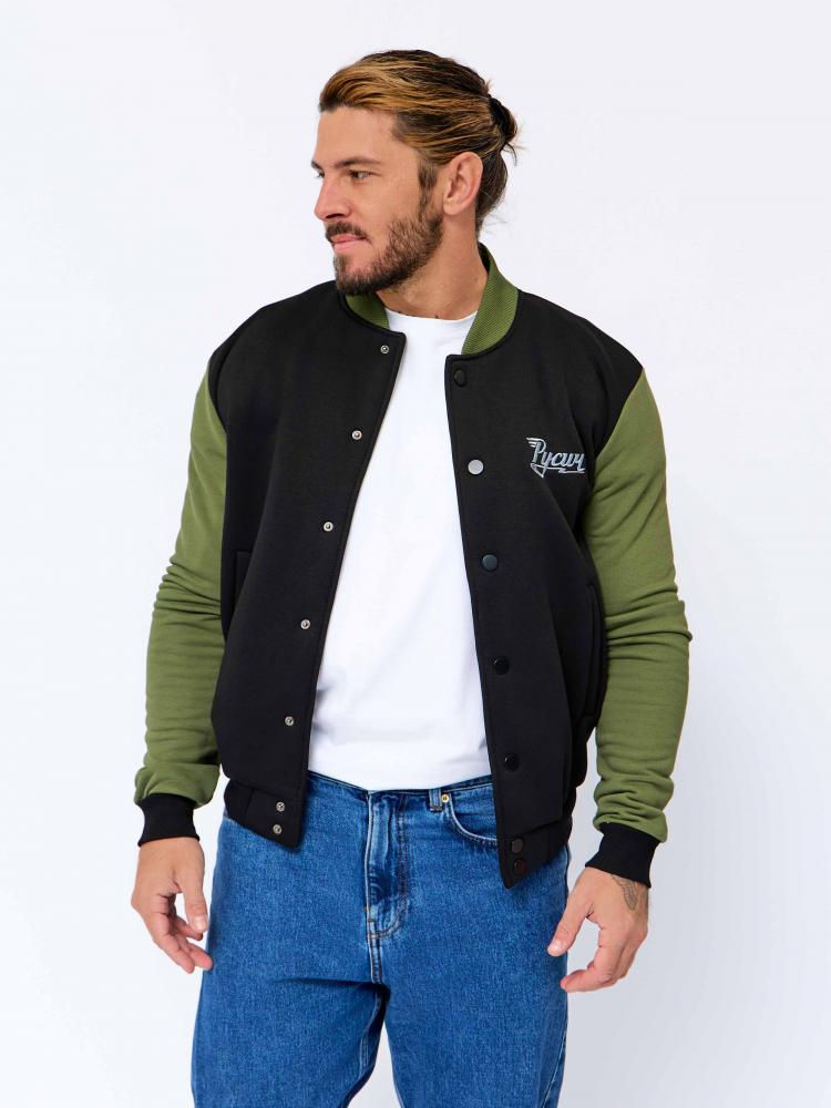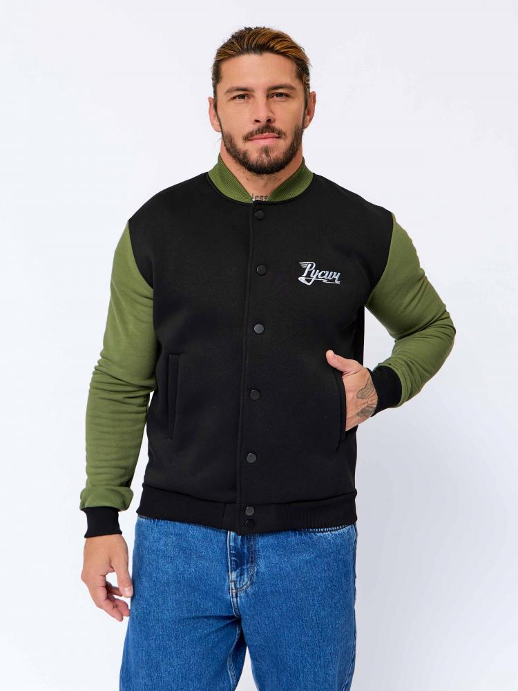 Обновлённая мужская толстовка-бомбер «Русич» на холодную погоду в комбинированном цвете: основа - чёрная, рукава - хаки.