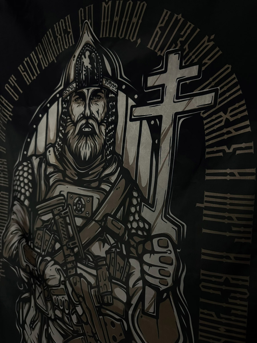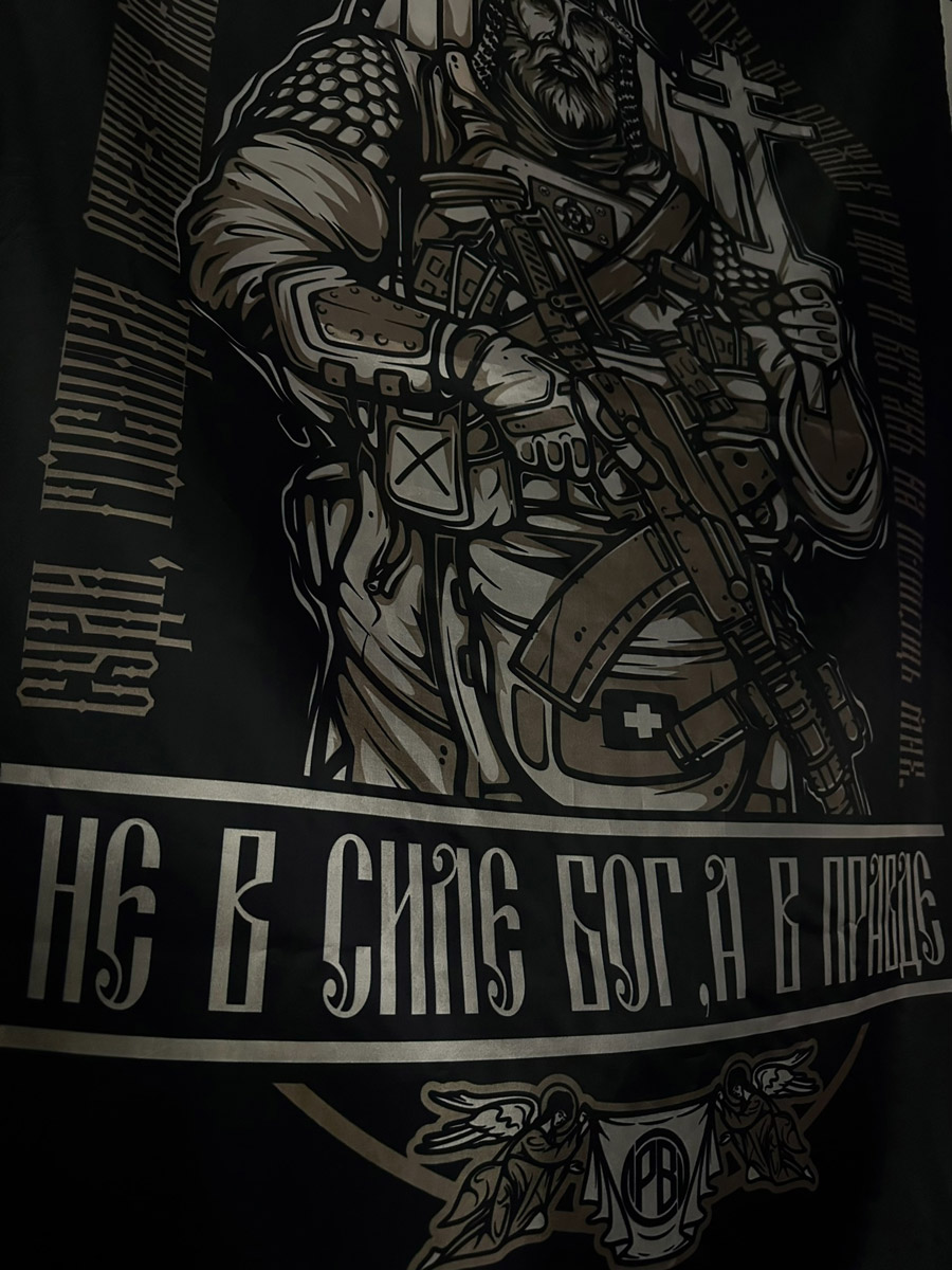 С левой стороны карман для древка с фиксирующей резинкой.100% полиэфирный шелк плотностью 55 г/кв.м.