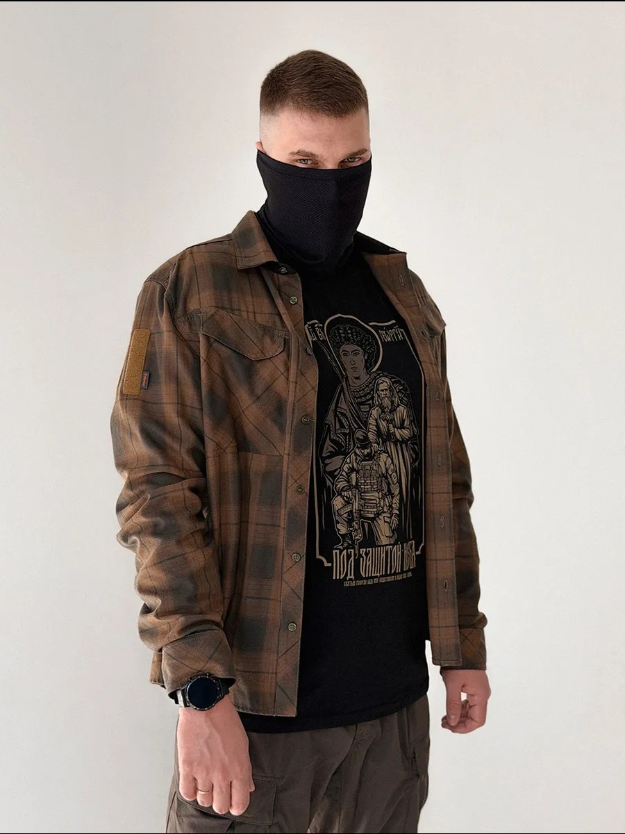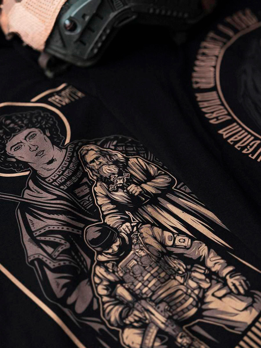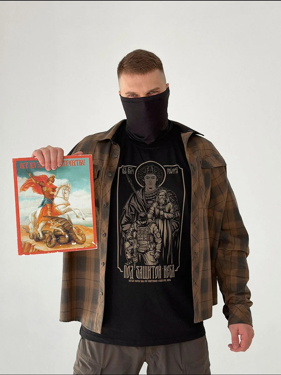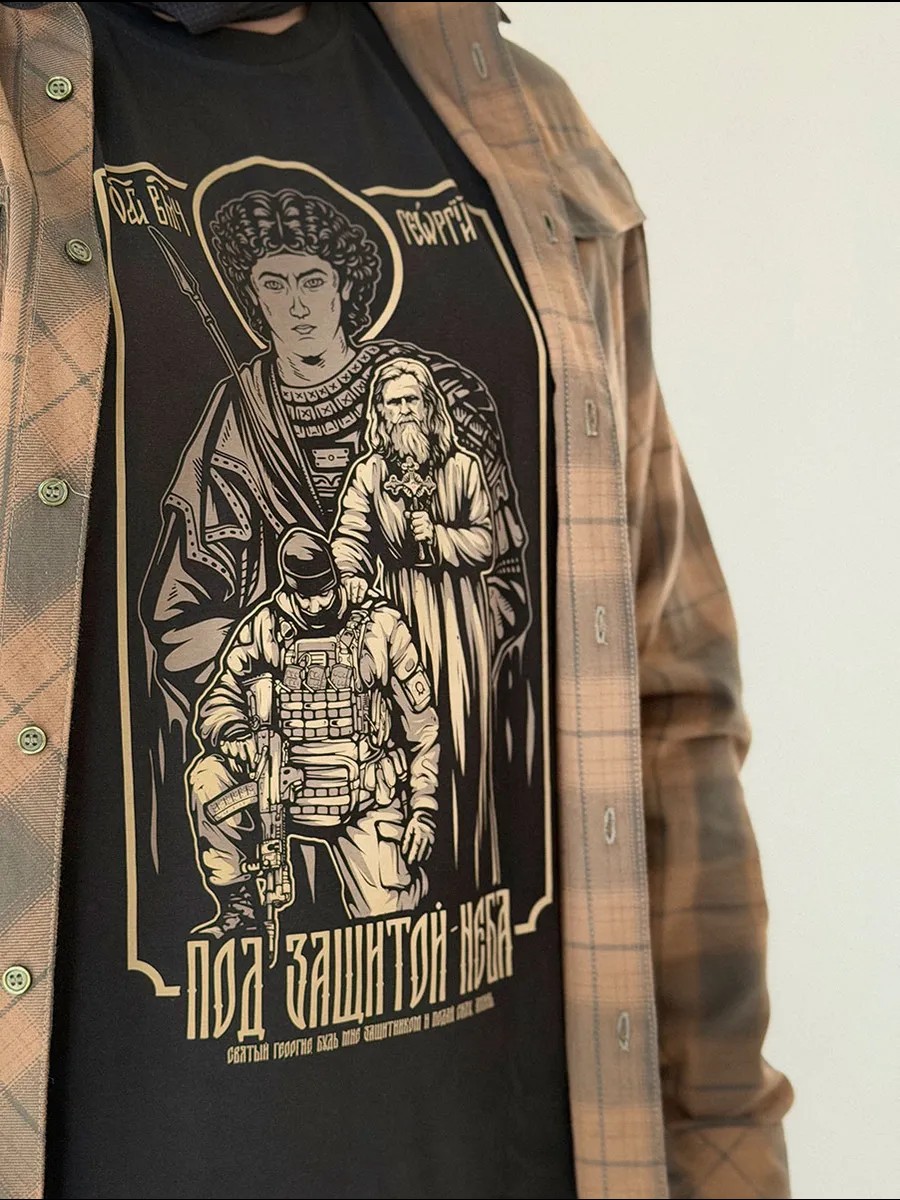 На заднем плане образ Георгия Победоносца — небесного покровителя воинов. Его присутствие напоминает: там, где есть вера и отвага, человек находится под защитой неба.