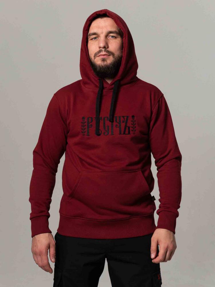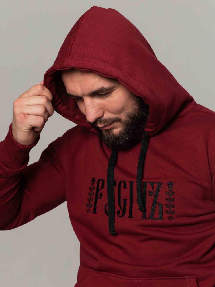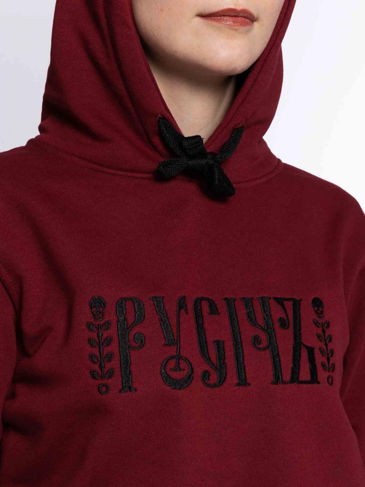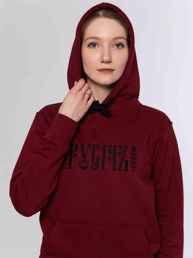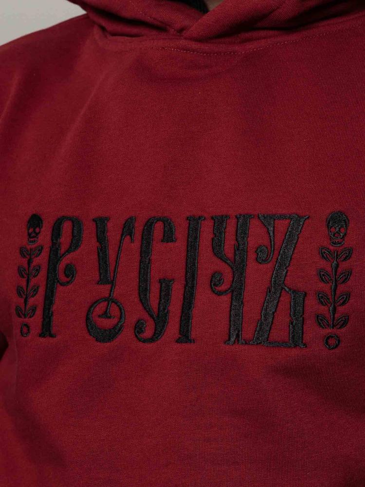 Классический худи тёмно-бордового цвета с большой вышивкой «Русичъ» на груди.
