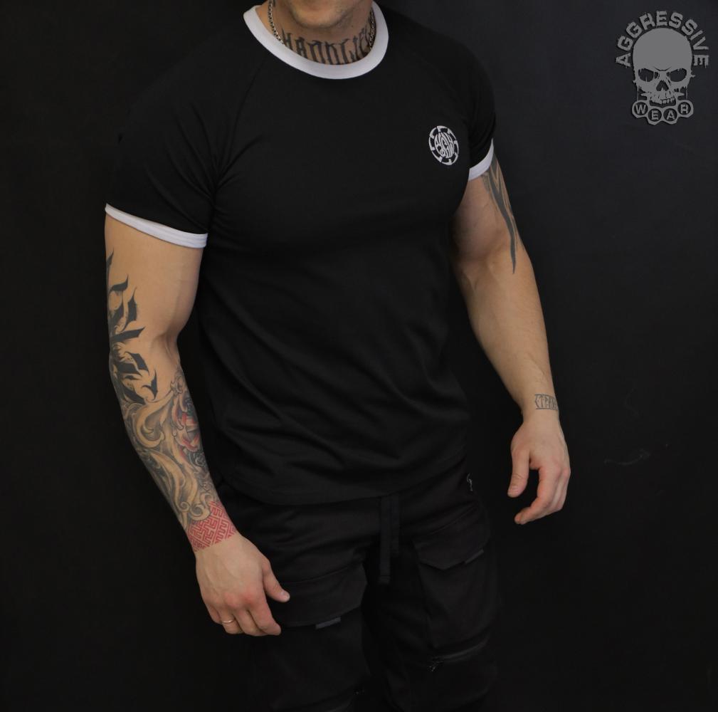 Мужская футболка реглан из базовой коллекции «Русич» чёрный цвет с кантом и вышивкой.