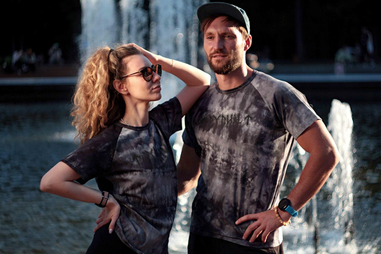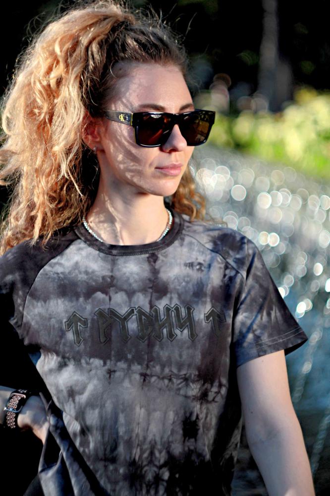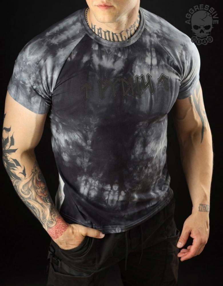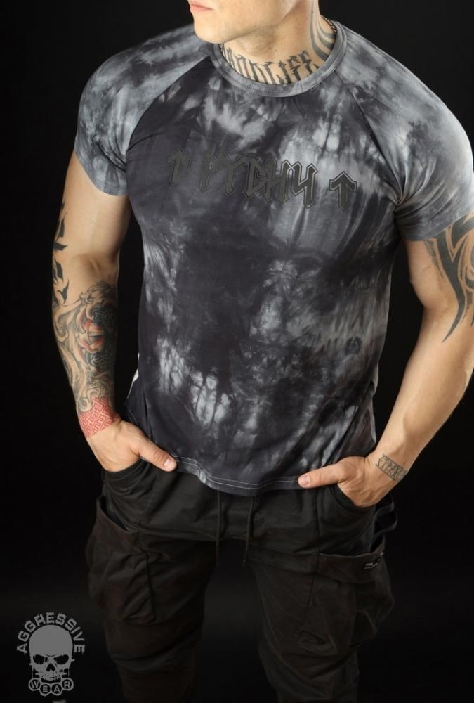 Мужская футболка реглан из коллекции «Русич Руника» с вареным эффектом в тёмно-сером цвете тай-дай.