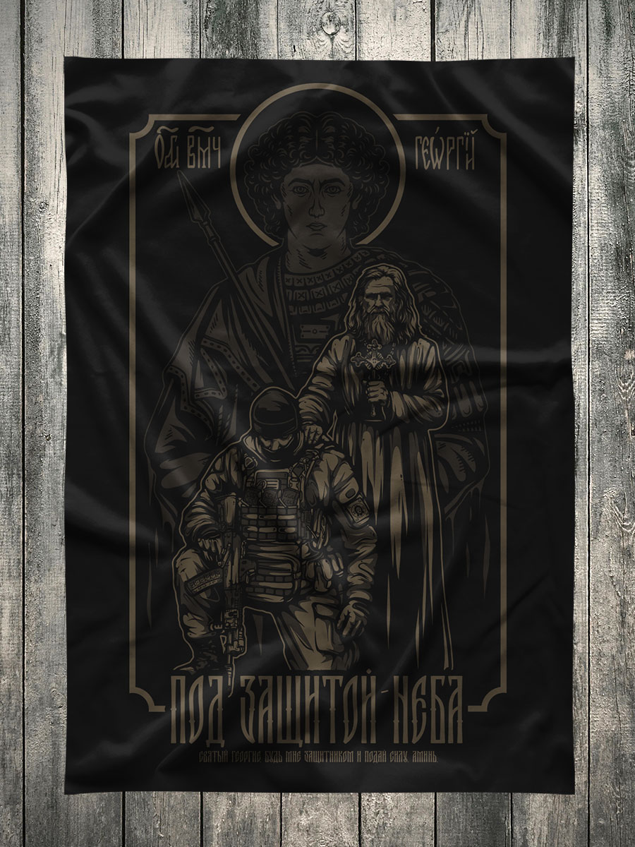 На груди футболки изображение «Слава России», выполнено в оригинальном трафаретном шрифте. Внутри букв гармонично вписан силуэт герба России, что добавляет особую значимость и патриотический смысл дизайну.